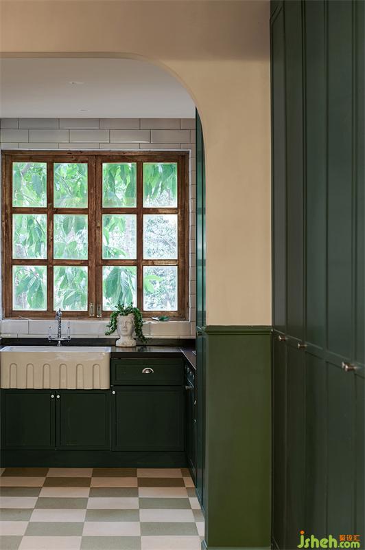 廚房整體以干凈為主,利落的線條和色彩,不同于客廳的濃烈,并使用馬賽克鋪磚和金屬點(diǎn)綴為廚房打造出復(fù)古的時(shí)尚感。