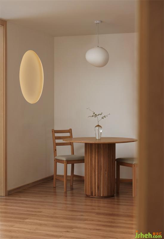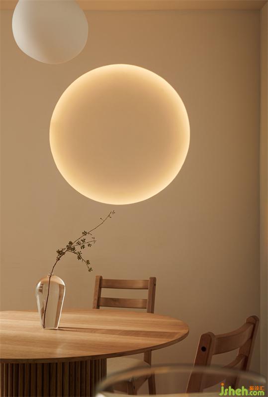 廚房增加圓洞造型墻,加上燈帶營造餐廳溫暖氛圍感,暖白鵝卵石造型吊燈與圓桌呼應(yīng),盡顯日式風(fēng)的簡潔與淡雅。
