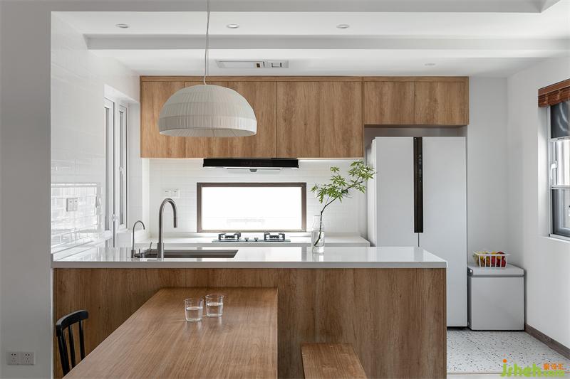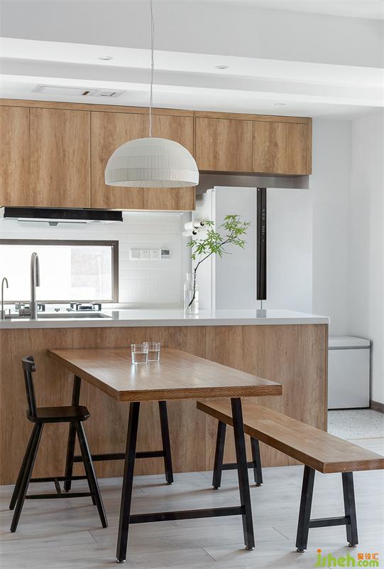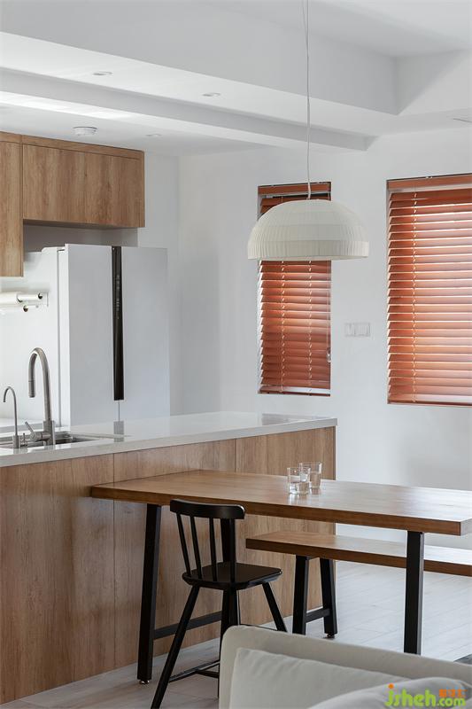從玄關進來便進入整個空間的公共區(qū)域,我們希望達到空間的流動感,拆掉了室內大部分非承重墻體,重新規(guī)劃布局,餐廚空間與客廳并存,讓各個空間的關系更為互通互融。
