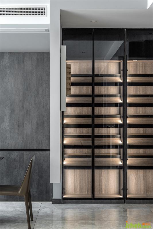 廚房巧妙利用空間設置酒柜,玻璃柜門,朦朧燈光,平添高級感。島臺通過設計比例構成而定制。