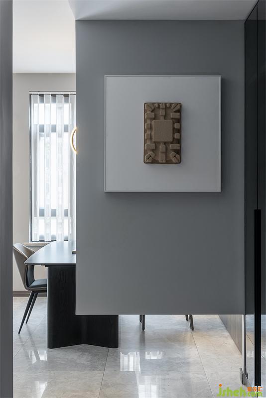 進門即見鞋柜,玻璃柜門并暗藏燈帶,增加夜晚歸家照明度的同時,滿足業(yè)主展示多余的鞋品收藏。玄關懸空設計,既形成空間切分,又有關聯(lián)空間的延伸感,畫作由設計師利用廢棄的包裝盒,通過特殊的制作工藝裝裱成畫,別具匠心。