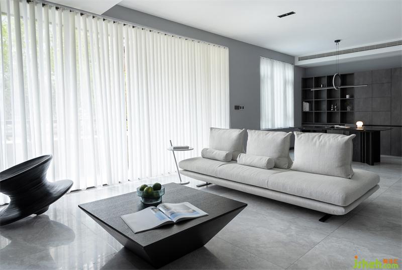 客廳的門窗采用折疊玻璃,想要近距離接觸大自然,可以完全折疊打開。平時進出陽臺可以只打開右側一扇,窗內的豎百葉簾裝飾,通過陽光照射讓整個空間更加靈動。