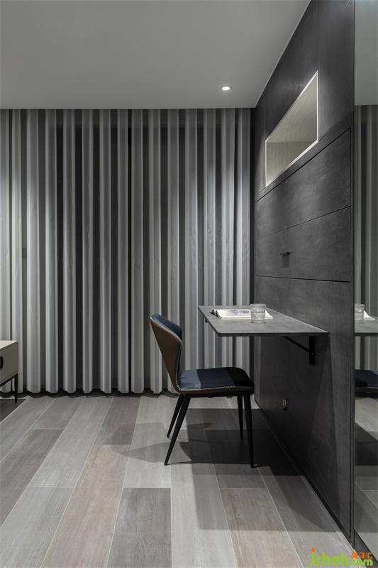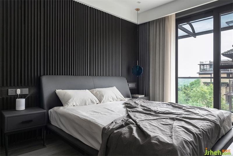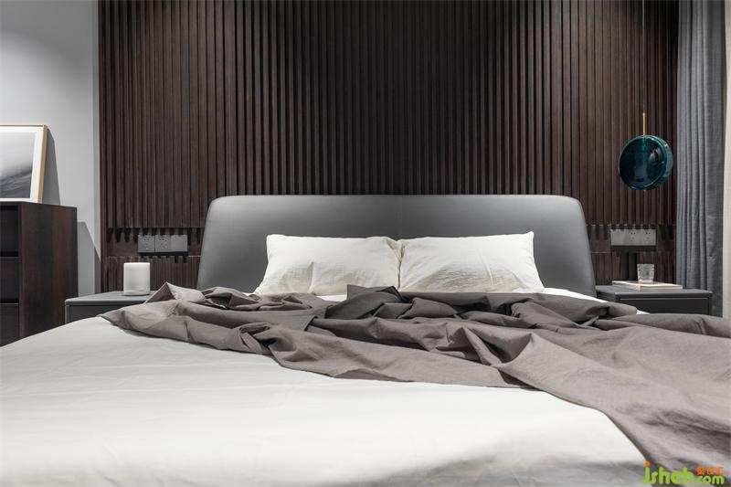 主臥房內(nèi)暗階色調(diào),渲染安穩(wěn)的氣氛空間;床頭用波浪板飾面造型,靈動有序,讓整個安靜的空間動起來。