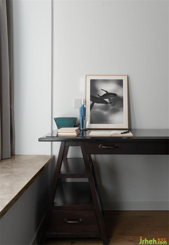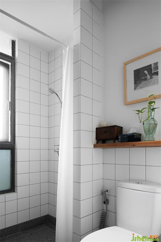 公衛(wèi)的設(shè)計(jì)簡(jiǎn)單干凈,淋浴區(qū)只用一段小墻隔離,暗藏浴簾,方便簡(jiǎn)練;洗臉區(qū)的超長(zhǎng)浴室柜儲(chǔ)納充足,使用方便;古董手繪鏡子和日本原作版畫,現(xiàn)代攝影小品的組合,使得這個(gè)常用的功能區(qū)別有風(fēng)情。