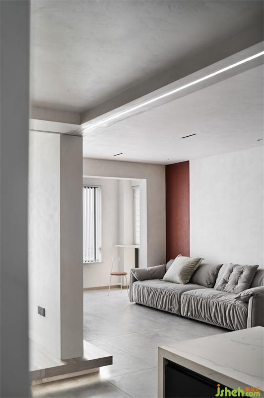 進(jìn)入客廳后,一方地臺和電視墻交融
