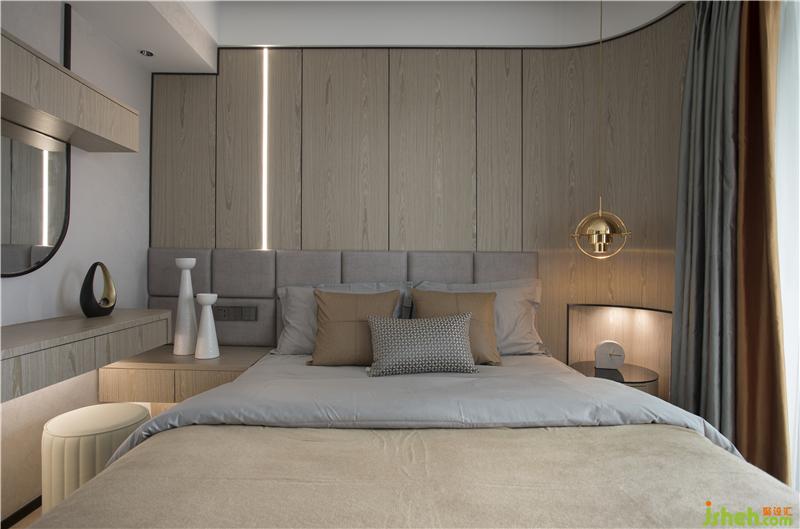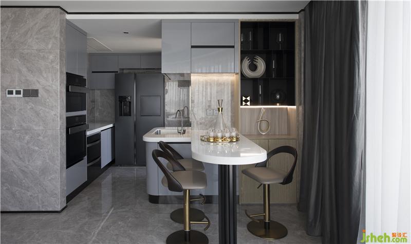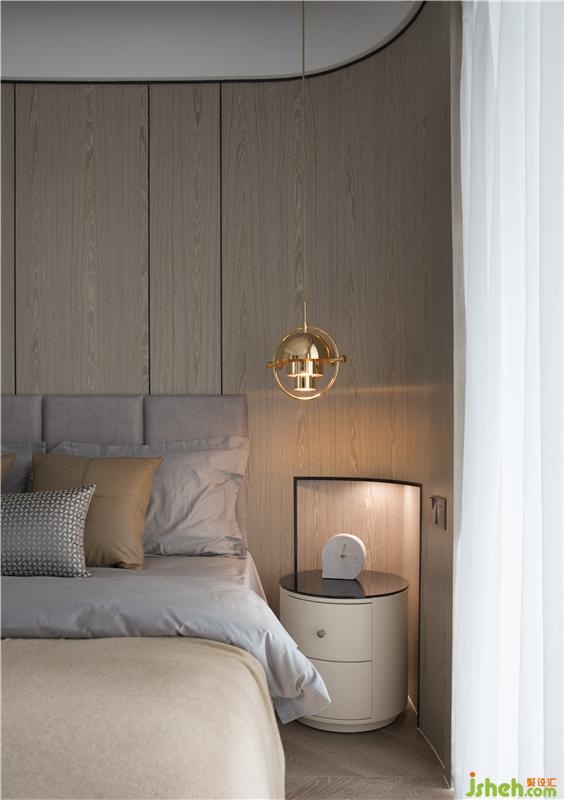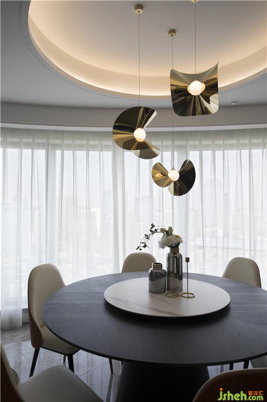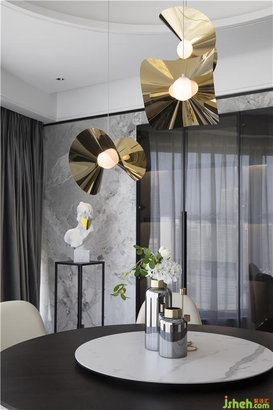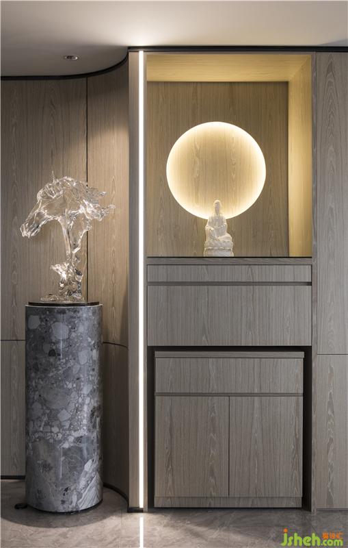 每一件家具、每一件雕塑、甚至是餐廳一盞動感造型吊燈設(shè)計,都是居住者品味與素養(yǎng)的縮影。玄關(guān)處弧形角落的視覺焦點是馬頭鉑晶雕塑的精美擺件,再者,過渡到現(xiàn)代簡潔的佛龕。佛龕具備多個暗藏式收納與使用功能,簡約的處理,使其更能融合到現(xiàn)代空間。