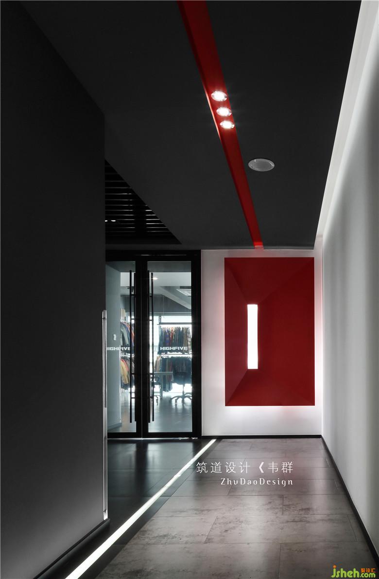 走廊的設(shè)計也頗具獨特性。在白色墻面和黑色頂面的基礎(chǔ)上加上一抹紅色直線,整個走廊就變得活躍了起來,同時搭配地面上的線性燈,在滿足視覺審美的同時又兼具動線引導(dǎo)的功能。在走廊末端墻面設(shè)置的紅色幾何造型壁燈既是對頂面色彩的呼應(yīng),同時作為一個視覺中心,在人們行走時產(chǎn)生探索的心理,從而降低長距離走動時的疲憊感。
