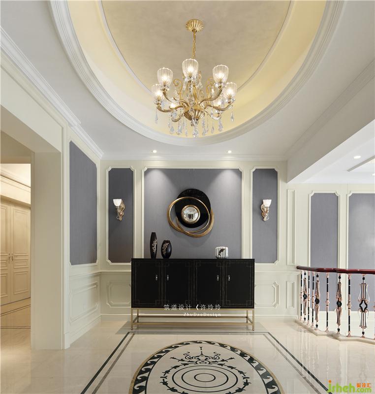 樓梯廳:順著樓梯而上,便可看到新古典主義畫風(fēng)的墻面,經(jīng)典的藝術(shù)裝飾、工藝品,充滿了濃厚的藝術(shù)氣息。別墅裝修設(shè)計(jì)