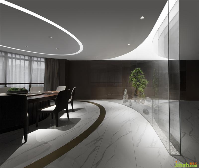 唐代詩人于武陵在《尋山》中寫道:青山如有利,白石亦成塵。水闊應(yīng)無路,松深不見人。玻璃枯山石景意為內(nèi)心明靜與克制。撥云見山,符號(hào)化永遠(yuǎn)是設(shè)計(jì)人踏遍內(nèi)心的追尋,抑揚(yáng)頓挫,抑或記黑當(dāng)白,記白當(dāng)黑,這是空間的韻律、節(jié)奏與虛實(shí)關(guān)系。辦公室設(shè)計(jì)