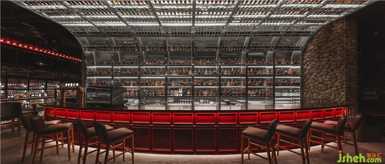 琳瑯滿目的美酒填滿了水吧區(qū)的酒柜,它是大廳的焦點,很遠就能感受到吧臺給人帶來的視覺沖擊。光滑的銀色金屬材質(zhì),與紅漆吧臺有了色彩和質(zhì)感上的碰撞,形態(tài)被設(shè)計成了一個由下往上向外延伸的弧形,像是美人從暗處伸出的手,酒吧設(shè)計杯中酒光攝人心魄,讓你迫不及待地想邀她共飲。
