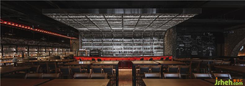 酒吧整體的燈光偏暗,但進入大門后,冷艷的紅漆柜臺和紅色燈飾像是拉丁舞女郎的紅色高跟鞋,酒吧設(shè)計立刻極富沖擊力地跳進人們的眼球。斑駁的紅磚,木質(zhì)的桌子和高腳凳,加上整體底調(diào)用了冷感的紅與黑的美妙搭配,組成了這個美式復(fù)古的品酒空間。