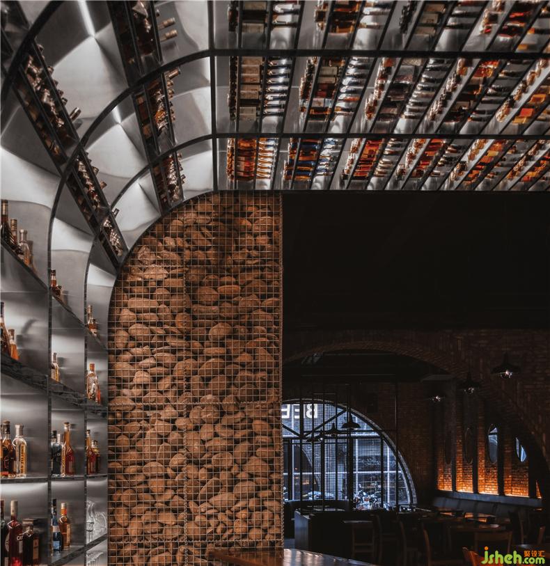 酒吧里還有個頗長的啤酒長廊,與水吧區(qū)環(huán)繞著全開放式的大廳,這為喜歡社交聊天的人保留了舒適的公共空間。隔墻用鐵網(wǎng)石籠與傳統(tǒng)隔斷,就像粗曠與精細的強烈對比,顯得趣味十足。酒吧設(shè)計