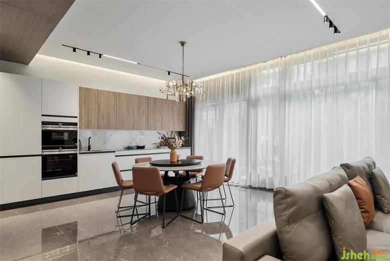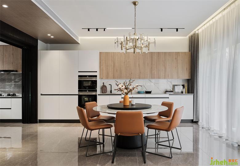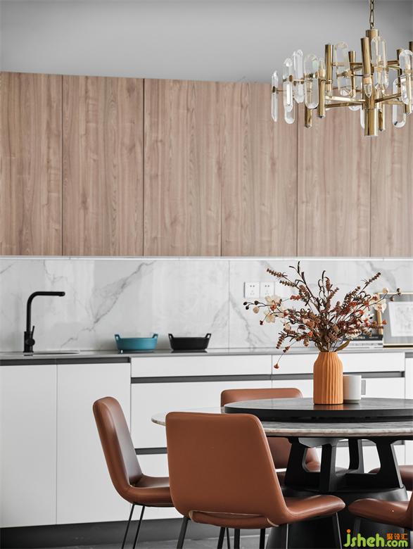 棉麻布藝的椅子,皮質(zhì)沙發(fā)、素色的茶幾、橘棕的軟裝點綴,一系列輕奢橙亮色的使用點到即止,空氣仿佛脆而甜潤,引發(fā)初秋景象的記憶與聯(lián)想。