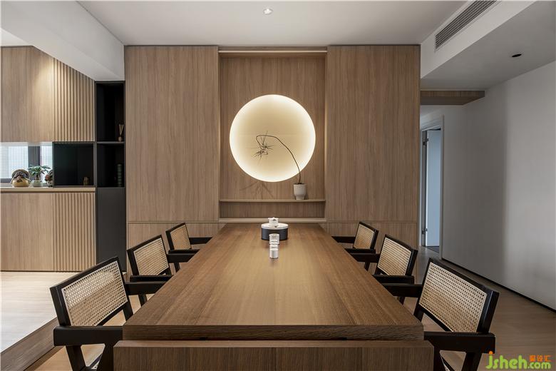 設(shè)計(jì)師在純凈的木色空間中,降低了裝飾性的干擾,“一輪明月”位于空間中央,方中帶圓,光影之中點(diǎn)綴一株植物,布局的素雅與木質(zhì)的溫潤(rùn)給人一種寧?kù)o溫馨。