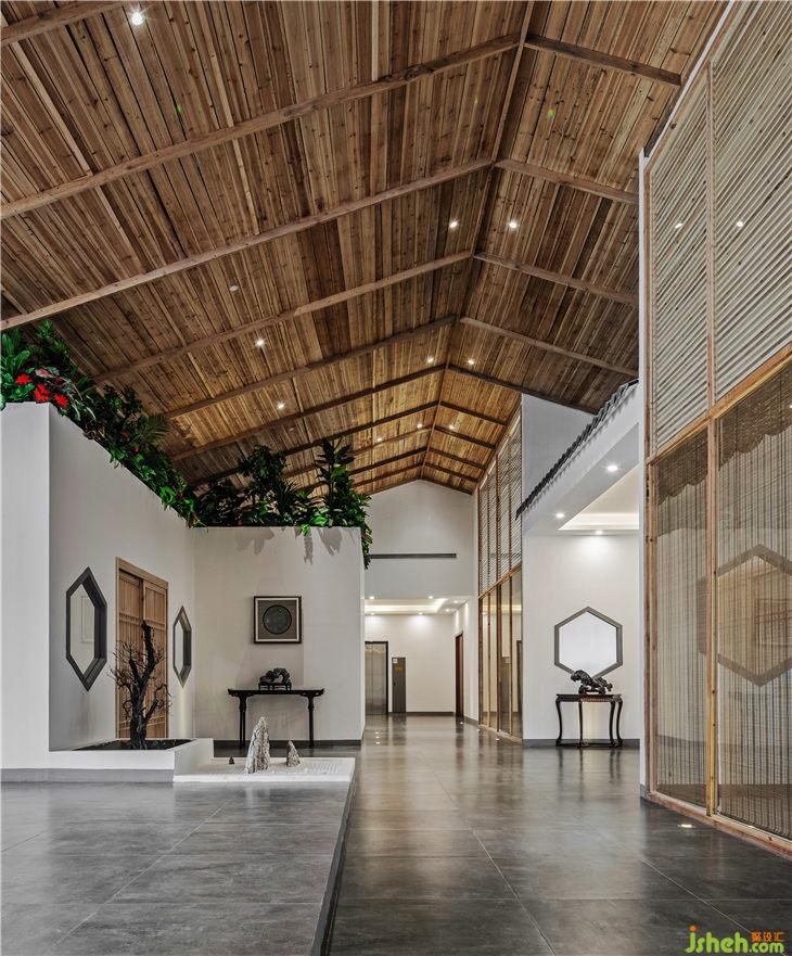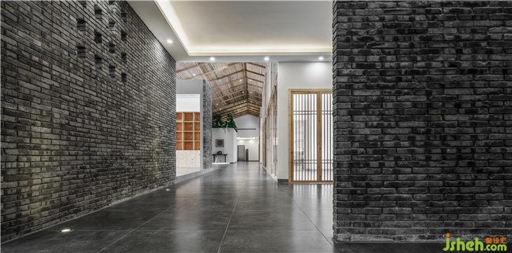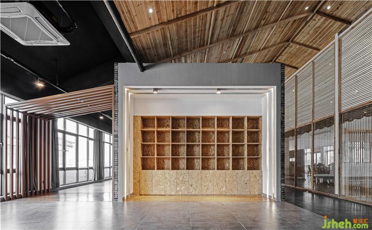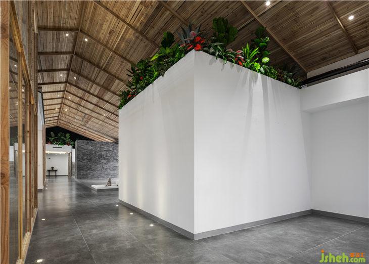 東西兩邊入口,白色乳膠漆墻面與江南常見的灰磚兩相呼應(yīng),頂部預(yù)留足夠的空間設(shè)立屋頂花園。讓屋頂內(nèi)再有屋頂,不同空間之間有效得到緩沖,同時(shí)解決高度不一,材質(zhì)不一造成的節(jié)點(diǎn)收口問題。模塊化的玻璃隔斷有規(guī)律的一字縱向展開,用來分隔兩種不同功能分區(qū)。立面上一分為二,解決6米多層高帶來的困惑,材料上采用原木木方呼應(yīng)公共區(qū)域的吊頂材質(zhì)。