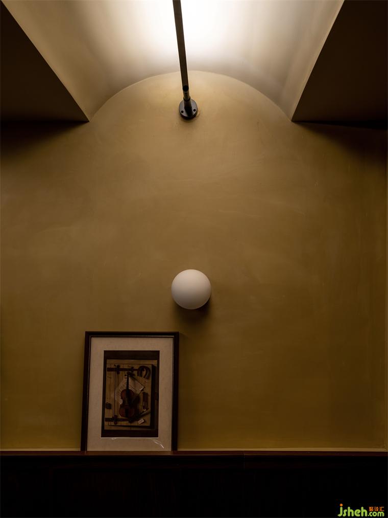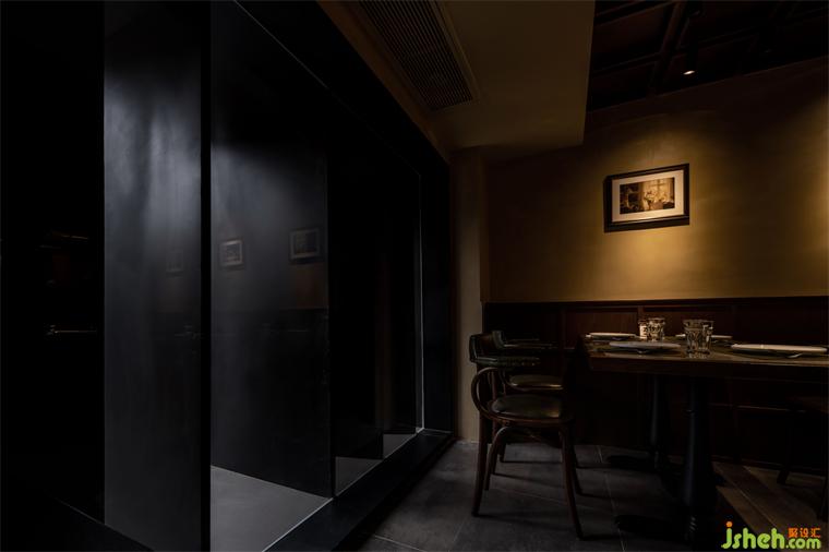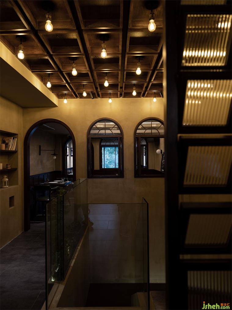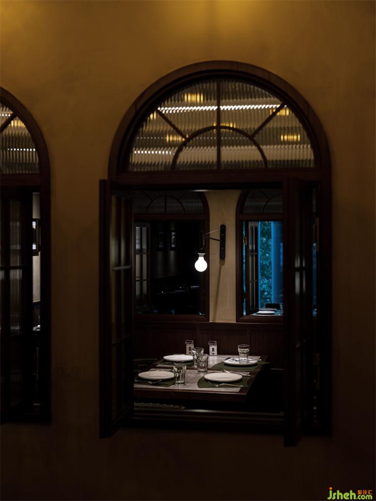 材質(zhì)上以木材,藝術(shù)漆,玻璃為主。木材可以傳遞溫潤而細(xì)膩的質(zhì)感,餐廳設(shè)計墻面肌理配于作舊的藝術(shù)涂料,以響應(yīng)新空間中的年代氣息,玻璃配以隔斷,透窗等多種形式的組合增加了空間的趣味,同時也延伸了視覺上的尺度擴(kuò)張。