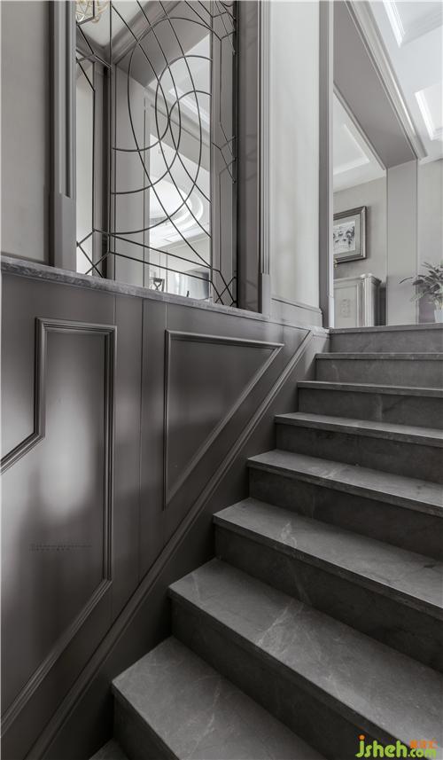樓梯空間的褐灰色的色調(diào)搭配,延續(xù)了整個(gè)空間的主色調(diào);別墅裝飾