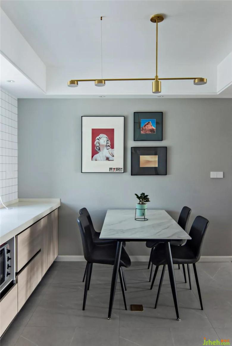 餐廳墻面裝修公司搭配復(fù)古精美的裝飾畫(huà),讓餐廚區(qū)有了別樣的精致感。