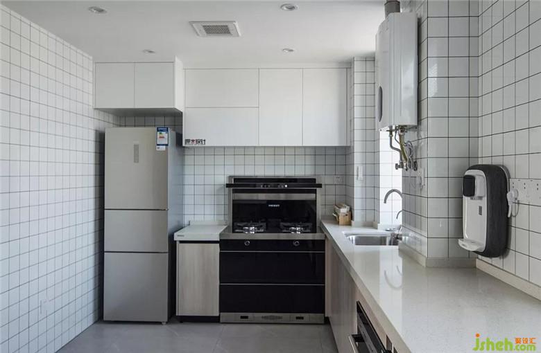 廚房的超大櫥柜收納功能齊全。亞光烤漆的吊柜搭配淺木色的地柜,裝修公司搭配上墻面的小白磚,整體氛圍清爽而自然,表達(dá)出生活貼近自然的理念。