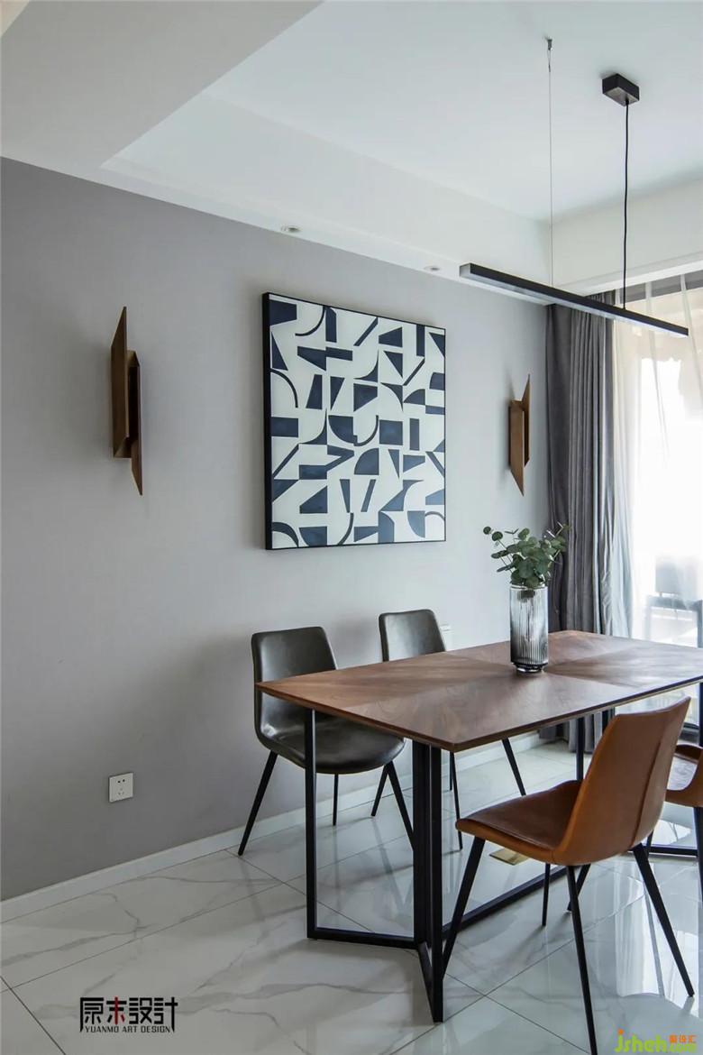 ▲ 餐廳是家人圍坐一起溝通交流、分享美食的重要空間,木質的餐桌裝修公司搭配兩把皮色不同的餐椅、溫潤的細節(jié)撫慰人心,而幾何圖案的肌理畫,金屬質感的壁燈,又將餐廳裝點得現(xiàn)代感十足。