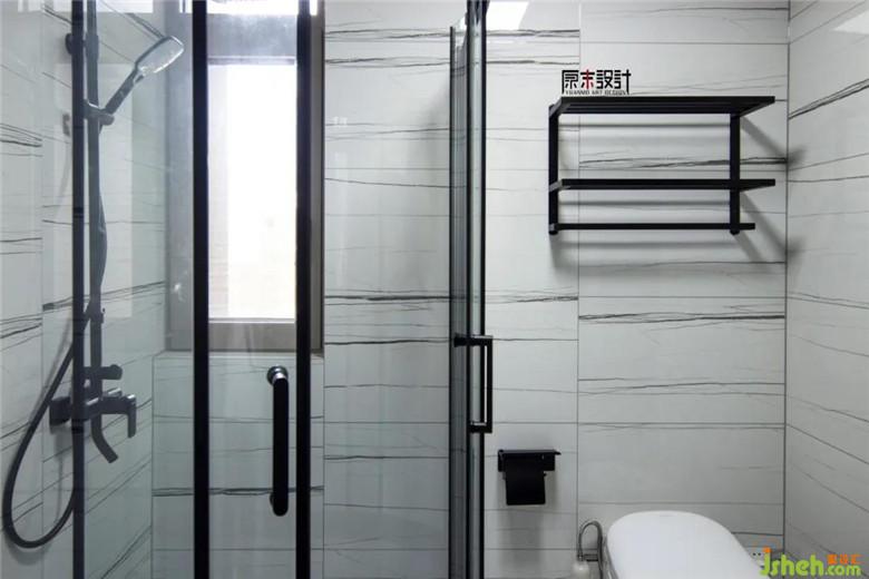 ▲ 一種現(xiàn)代的生活方式,有對精神世界的回應和生活本身的渴求。衛(wèi)生間的白色不規(guī)則紋理磚,搭配了黑色邊框淋浴房和配件,整體氛圍干凈清爽且富有個性。