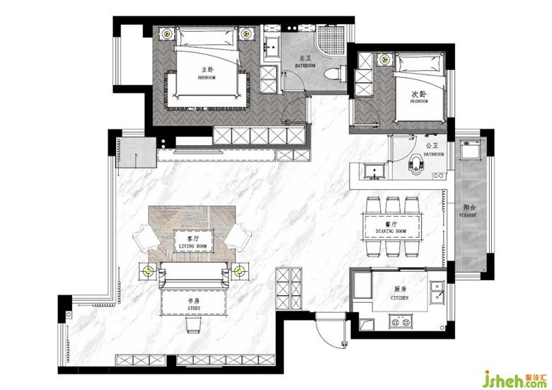 ▲ 被黑白灰圍裹,足夠安全,用質感打破空間沉悶,自在呼吸。臥室主背景的中灰色墻布,與其他墻面的淺灰色進行了良好的呼應與過渡,裝修公司在搭配上現(xiàn)代感十足的床品和吊燈,整體空間氛圍簡約而不簡單。