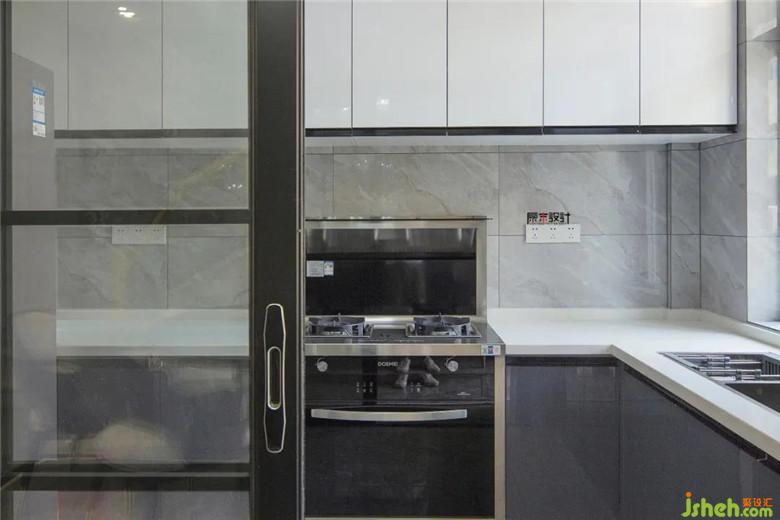 ▲ 廚房亮面的墻磚配以白色和灰色櫥柜的烤漆門板,讓整個廚房層次分明,利落干凈。