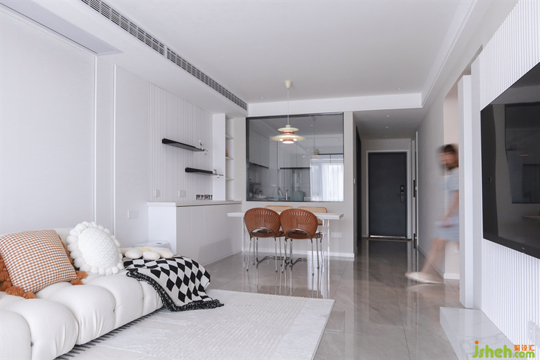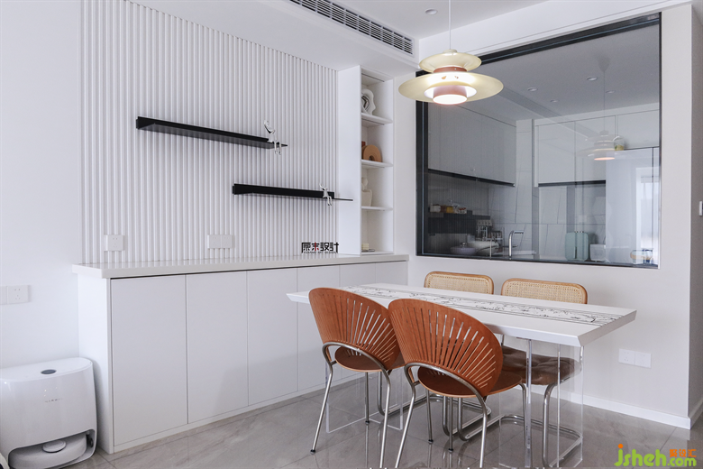 ▲ 白色層次的墻板,搭配房屋中的軟配,圓潤感十足的家居使原本生硬的空間變得柔和了許多,家裝設計增強了客餐廳整體的視覺通透性。