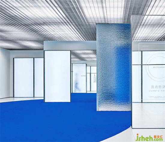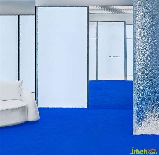而在冰凍的深處是一片藍色,F(xiàn)ITTING ROOM呈現(xiàn)的是一塊ICE CUBE ,水紋玻璃的盒子包裹著一個藍色的體塊,感受到能量、傳遞、純粹,一種靜謐的、無雜質(zhì)、的游走狀態(tài)。
