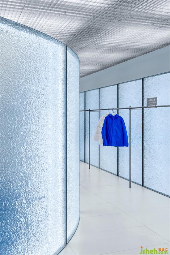 雪消又冰釋,水波紋玻璃在四周環(huán)繞,一切都像是被添上了一層縹緲的濾鏡,包裹感在此處擴散開來,上海專賣店設(shè)計特殊材質(zhì)的肌理感帶來平靜與起伏的碰撞感。