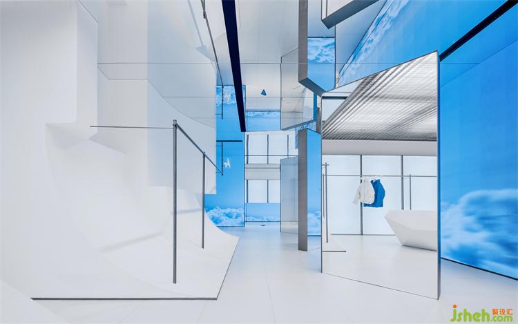 屏幕所表達(dá)的動(dòng)態(tài)關(guān)系、空間的相對靜止、體驗(yàn)者的行進(jìn)過程三者之間形成一種冰凍廣場的呼吸節(jié)奏。而在天空人以及冰凍廣場的表達(dá)中,看的視角與行走的狀態(tài)是一種非常有趣的內(nèi)容,互動(dòng)屏有非常多表達(dá)可能性,可以在時(shí)間上做到與真實(shí)城市空間同頻,也可以展示完全不同的“天空人”視角的行走狀態(tài),上海專賣店設(shè)計(jì)更多的是一種態(tài)度與狀態(tài)的表達(dá)。我們希望能用這種特殊的觀看方式引起用戶的好奇感,駐足,并且探索。
