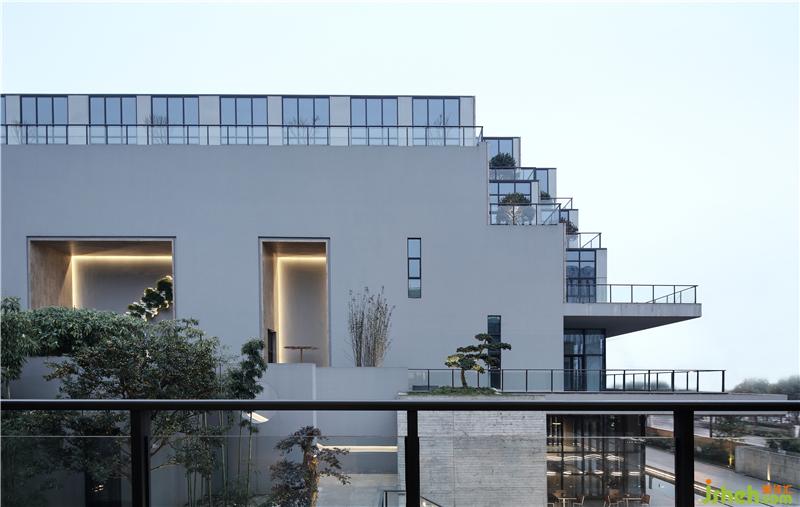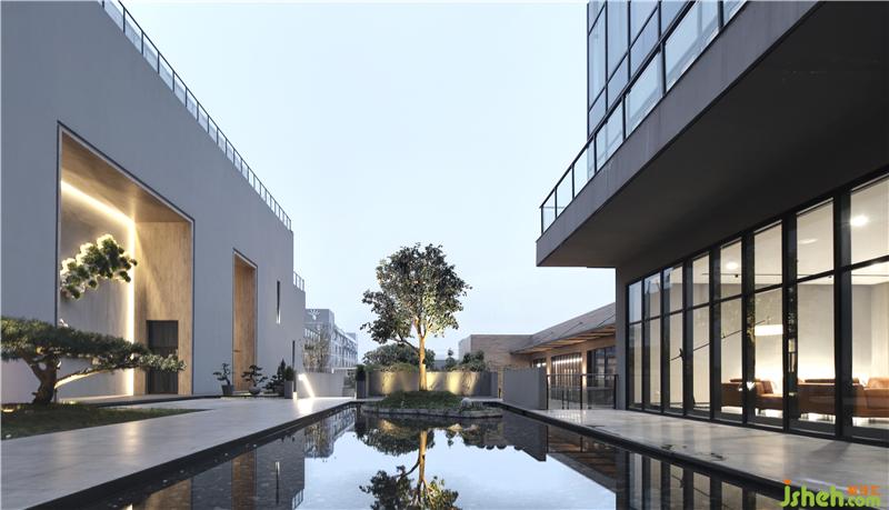 如何在原稍顯陳舊的工業(yè)園區(qū)中打造一個富有有時代性與國際視野的企業(yè)形象是我們執(zhí)筆前考慮的重中之重。通過對企業(yè)的內(nèi)部功能需求,不同區(qū)域?qū)θ照招枨蟮姆治黾翱茖W(xué)合理的交通動線規(guī)劃,圍繞著水院,在功能上由南向北劃分了辦公樓、企業(yè)接待會所、企業(yè)管理中心、倉儲中心。通過建筑BOX的巧妙穿插、抬高、挖空、切割,用雕塑的手法構(gòu)造出“堆山式”的建筑,使整體的建筑空間既有良好的采光又有和而不同的形態(tài)韻律之美。庭院水系的取巧劃分,給來賓一番有別于常規(guī)工廠慣性認(rèn)知,恍如邁入一個生態(tài)自然的文創(chuàng)院落。由東向西的建筑抬地處理讓視野通達(dá),富有層次之美。