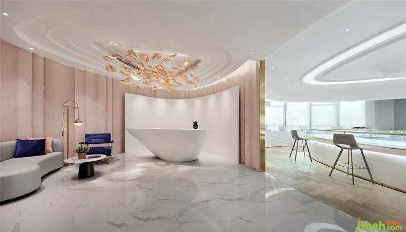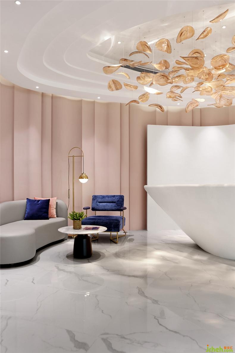 接待前廳以煙粉色呈現(xiàn)出褶皺感的墻面造型,與天花上曲線的燈帶形成呼應(yīng),晶瑩剔透的葉子燈飾在燈光的映稱下玲瓏有致。褪去了張揚的艷麗,冷靜而柔和的煙粉色,讓整個空間的氣質(zhì)優(yōu)雅而含蓄。