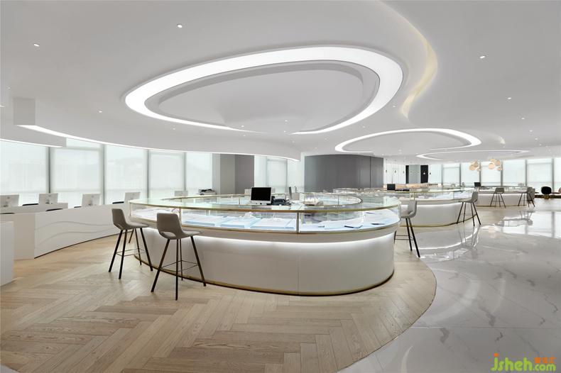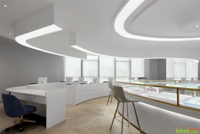 本案的珠寶展廳位于水貝銀座珠寶城,兼具展示、接待及辦公功能,室內(nèi)設(shè)計師的靈感來源于寶石的形態(tài)以及女性的柔美,韻律流暢的線條為展廳賦予了前衛(wèi)時尚的格調(diào),同時以不同質(zhì)感純凈的白為空間底色,煙粉、明黃、寶藍等點綴其中,打造夢幻輕奢的氣質(zhì)空間。