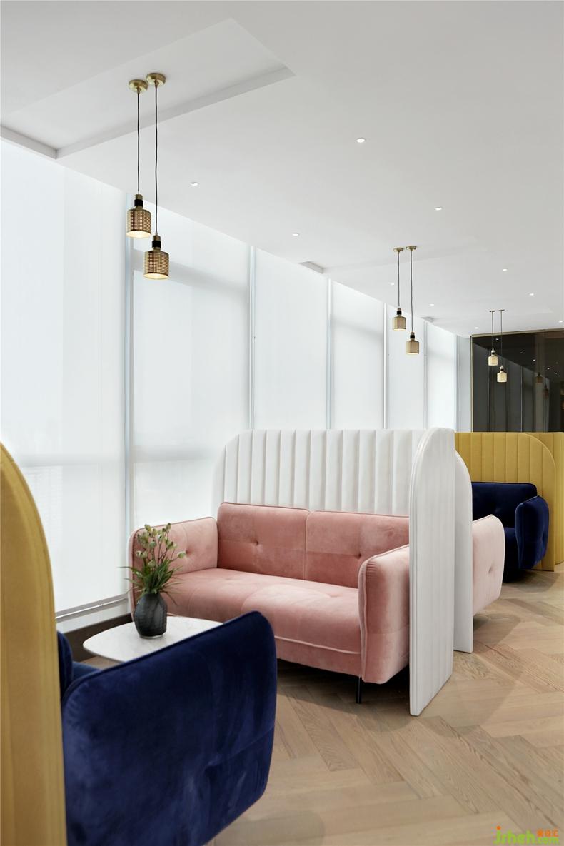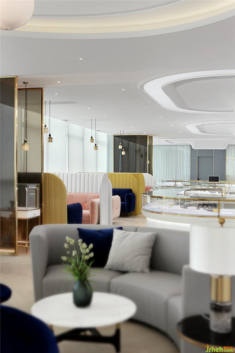 VIP洽談區(qū)的家具則以明黃、寶藍(lán)及煙粉的穿插,營造出一處輕松、明快、愉悅的交流空間。每一件珠寶的背后,都有一個(gè)浪漫的故事。在這樣現(xiàn)代、輕奢、時(shí)尚的空間里,感受琳瑯滿目的奇珠異寶,喝一杯咖啡,任誰都會對珠寶背后的故事好奇不已。