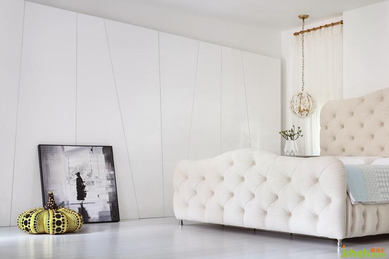奶白色的柔軟與草間彌生的藝術(shù)品《南瓜》,讓臥室自然而然成為一幅純粹的藝術(shù)作品,干凈透亮的視覺效果,將極簡主義美學(xué)發(fā)揮到完美。