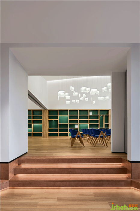 走在平臺(tái)上,通頂?shù)臅軐訉蛹痈叩耐瑫r(shí),不斷外凸,形成一道折線,形成一種呼之欲出的親近,幾何結(jié)構(gòu)也暗合了整個(gè)建筑內(nèi)部的棱角分明的洗練。室內(nèi)設(shè)計(jì)師