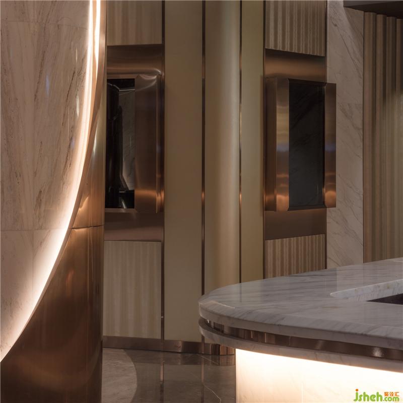旅程從大堂開始,兩個大堂均采用黑色金屬涂漆板、木飾板、鍍鎳不銹鋼柜臺、白色云石飾面墻和米色皮面墻等材料,通過不同材質(zhì)的光面和啞面特性,營造深淺不一的“鉛筆畫痕”。