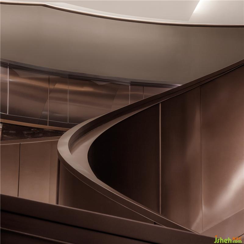 深陷漩渦之中,拾階而上,抵達(dá)四樓大堂,顏色隨之輕微轉(zhuǎn)調(diào)為以金銅為主,漸漸引領(lǐng)到鉛筆草圖之后的上色階段。