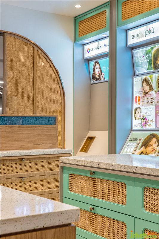 為了讓這類消費(fèi)者能夠第一時(shí)間識(shí)別到變美訊號(hào),設(shè)計(jì)師選用了辨識(shí)度極高卻不張揚(yáng)的淺綠色作為空間主色調(diào),同時(shí)在陳列柜的材質(zhì)上,選擇了更親近自然的木質(zhì)與竹編,讓小空間通透、輕盈,也讓消費(fèi)者產(chǎn)生一種誤入夏日森林的輕松與快意。