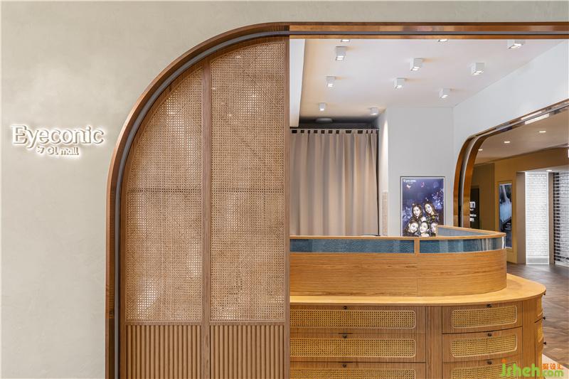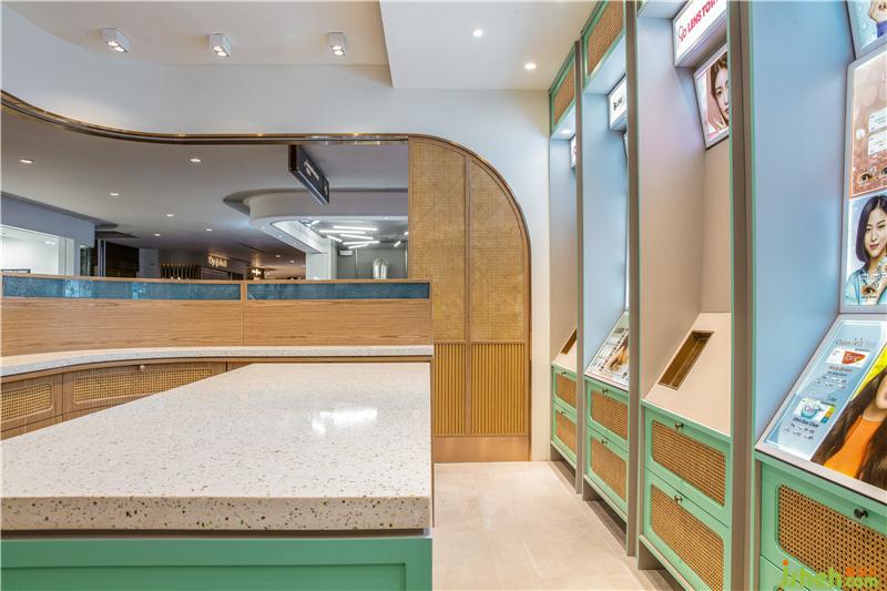 雖然店鋪空間狹小,但恰好位于轉(zhuǎn)角處,設(shè)計(jì)師把轉(zhuǎn)角位置全部打開(kāi),不設(shè)常規(guī)玻璃門(mén),而是與商場(chǎng)公共走廊直接聯(lián)通,形成一個(gè)大開(kāi)大合的空間,墻面轉(zhuǎn)角利用弧形緩和直線條的生硬,提升空間整體性。