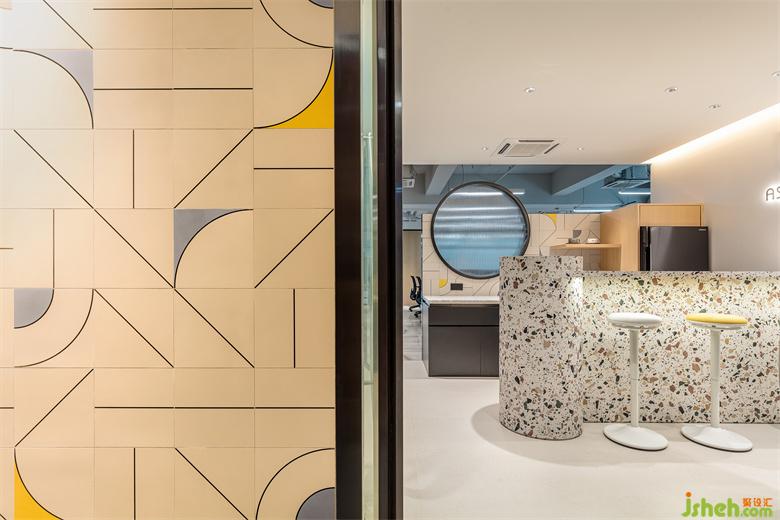 入口處,設(shè)計(jì)師以公司產(chǎn)品——花磚拼貼出涂鴉風(fēng)格背景墻,通過材料充分地展現(xiàn)品牌特性。