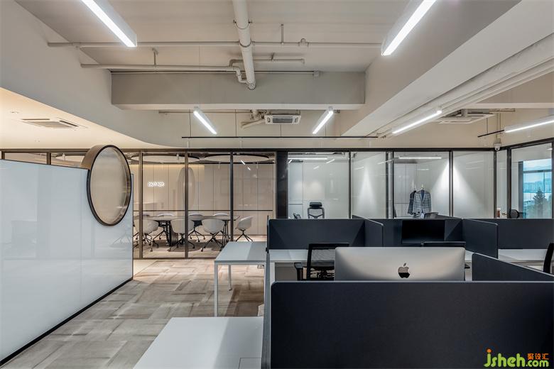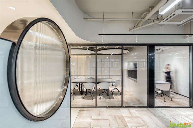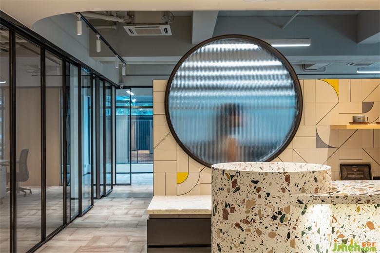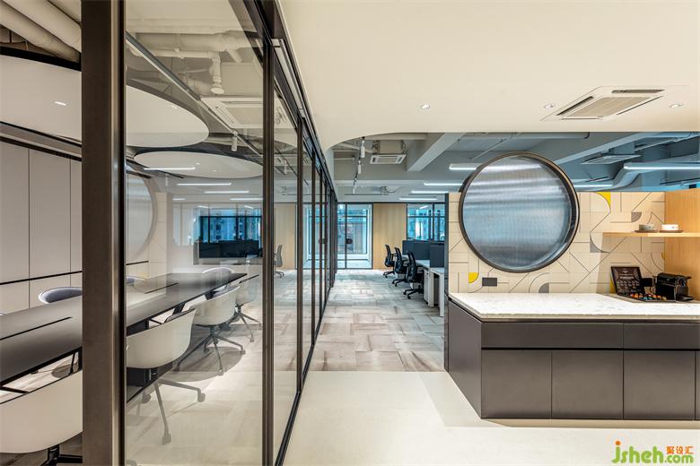 在休閑與辦公區(qū)之間的隔斷墻上,辦公室設(shè)計(jì)師以一個(gè)圓形長(zhǎng)虹玻璃打破沉悶,為空間增加更多通透性與趣味性,在隱約間,讓空間重新串聯(lián)。