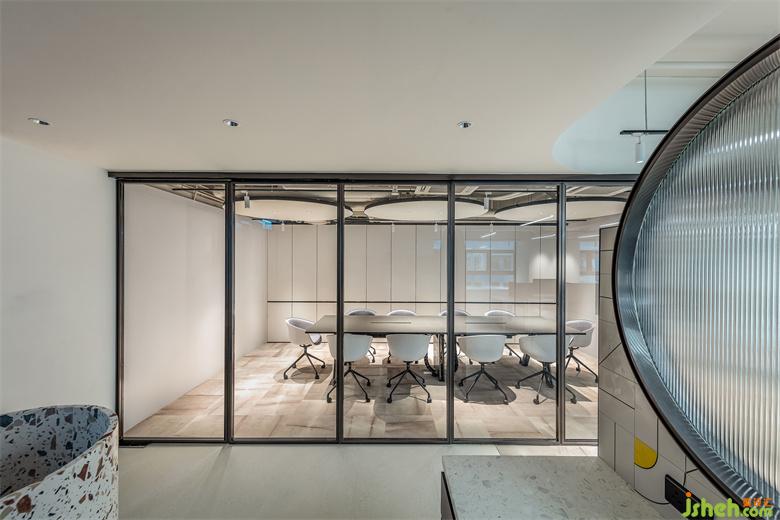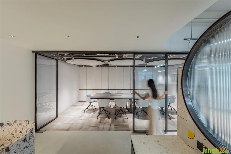 隨后,來到空間的重頭戲——會(huì)議區(qū),會(huì)議區(qū)豎向布局在開放式辦公區(qū)及社交區(qū)域的一側(cè),黑框窄邊玻璃推拉門形成會(huì)議室隔斷系統(tǒng)。