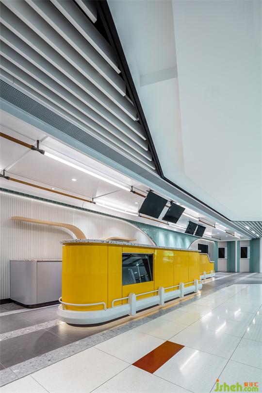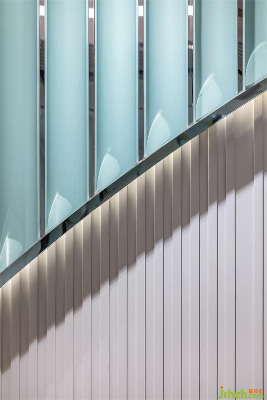 墻面與天花的格柵線(xiàn)條,采用不同材料拼貼而成,以疏密之分構(gòu)建一種遠(yuǎn)山淡影的意境。立體化后的墻面,在視覺(jué)上緩解售票區(qū)的狹長(zhǎng),走近時(shí)還能發(fā)現(xiàn)隱藏風(fēng)景。