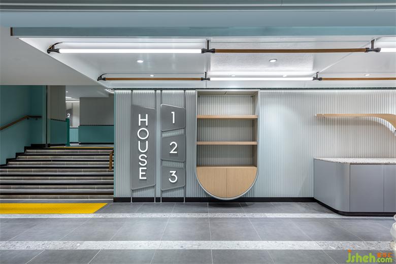 由于建筑本身結(jié)構(gòu)關(guān)系,售票區(qū)和影廳之間有7個(gè)臺(tái)階的高度差。影院設(shè)計(jì)師以不規(guī)則的導(dǎo)視標(biāo)識(shí)指引消費(fèi)者通往下一段未知的觀影之旅。
