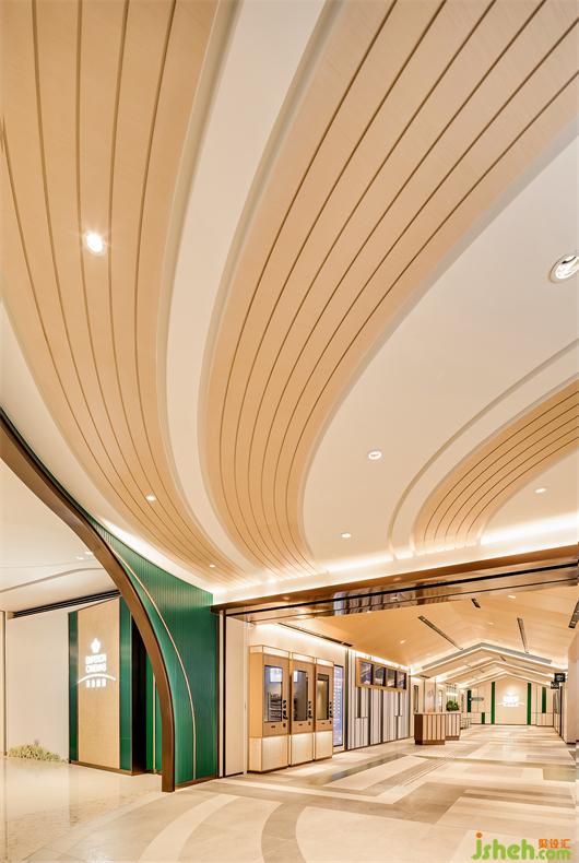一氣呵成的流線型入口,像一條無(wú)限延伸的道路,指向未來(lái)的自然生活。大面積的英皇綠既呼應(yīng)、強(qiáng)調(diào)了品牌視覺(jué)也吸引消費(fèi)者的目光,同時(shí),綠色作為大自然色系與品牌色,產(chǎn)生一語(yǔ)雙關(guān)的效果。