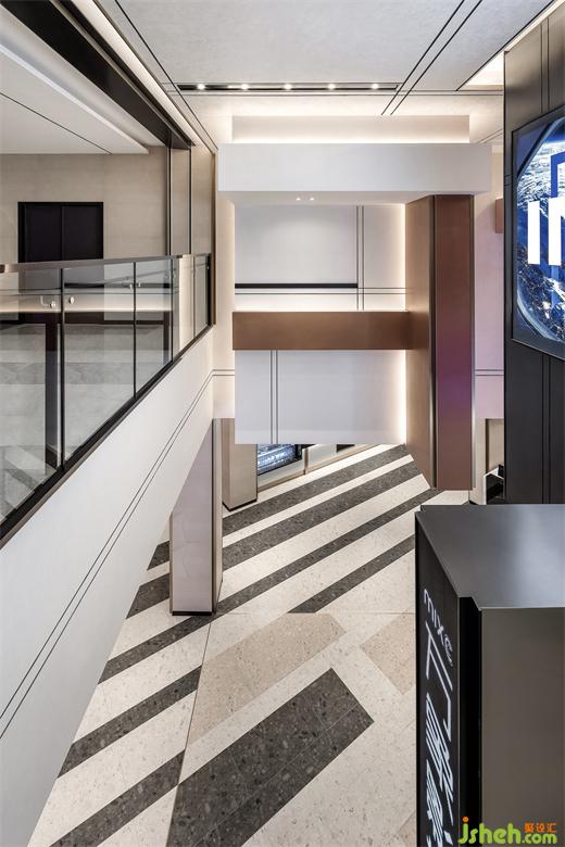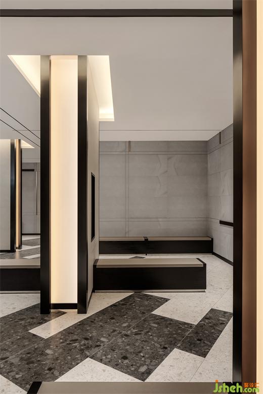 水磨石和砂鋼是整個影院最主要材質,水磨石的特殊紋理配以啞光質感的砂鋼,在淡色和暗色的重疊交互下,讓三維的俄羅斯方塊游戲在二維平面發(fā)生。