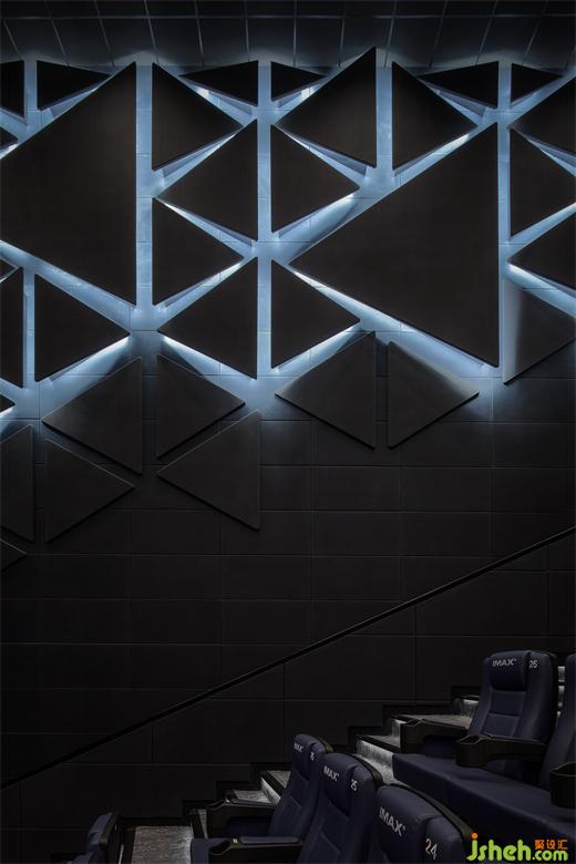 IMAX影廳中,兩側(cè)墻面是由捫布做成的冰雪浮雕,影城設(shè)計(jì)對稱代表著原生的秩序,而滲光的獨(dú)特造型則是叛逆下對穩(wěn)定的突破。