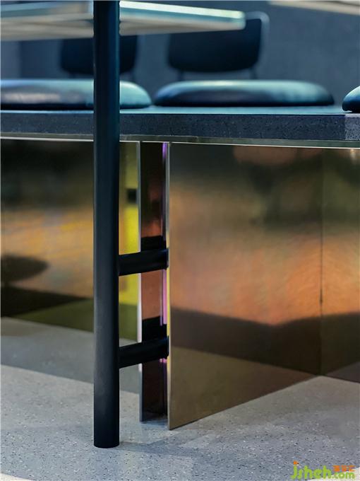 餐廳設(shè)計(jì)在這個(gè)相對(duì)銳利的空間中,冷冽的金屬與電鍍幻彩不銹鋼碰撞,通過(guò)隨機(jī)產(chǎn)生的色彩產(chǎn)生新的、自由的和失序的視覺(jué)沖突。
